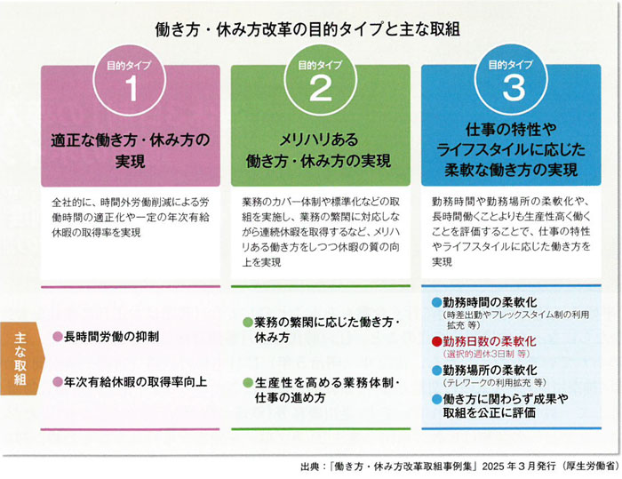 選択的週休3日制は、育児、介護、病気治療などと仕事の両立、大学院などでの学び直し、ボランティア活動、兼業や副業、余暇の充実など多様な働き方を望む人の働き方の選択肢を増やし、ワーク・ライフバランス向上を促進する施策として期待されています。